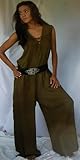 Easy to wear and brimming with casual elegance, this simple sleeveless jumpsuit is a natural for spring lagenlook design.Annie's created this with a sexy v-neckline and a bodice that you can fit just the way you like with the drawstring ties. It's looser through tthe torso and hip, and the legs are extra wide and extra elegant in their fluttery flow. Angled pockets at each hip add a casual appeal and have handy side access. Made up in Lotustrades' trademark and top-quality smooth rayon, a mid-weight fabric that's a silky soft delight to wear. And you won't find a fabric anywhere with a better or more luxurious flow.This is a great lagenlook piece to layer under an art-to-wear jacket. Over a tube top or cami. Or with a shawl and belt. Loose, comfy and non-restrictive. And so stylish it's simply a joy to wear. Enjoy it ladies, this is lagenlook at its' very best.
